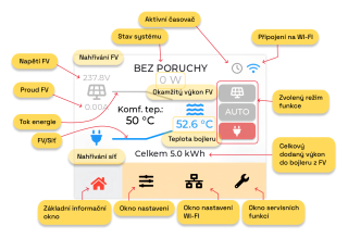 K jednotke je dodávaný snímač teploty, vďaka ktorému je možné nastaviť minimálnu komfortnú teplotu v režime plnej automatiky a odčítať aktuálnu teplotu v zásobníku. Jednotka vyžaduje trvalé pripojenie do rozvodnej siete, ale iba na prevádzku vlastnej riadiacej elektroniky alebo v prípade dohrievania zo siete na napájanie bojlera. Vlastná spotreba jednotky v čase ohrevu z FVE je približné 0,5 – 3 W (zhasnutý displej bez WiFi, rozsvietený displej, ventilátor, wifi komunikácia). Jednotka teda nemôže byť napájaná iba z FVE, vždy je nutná rozvodná sieť.
