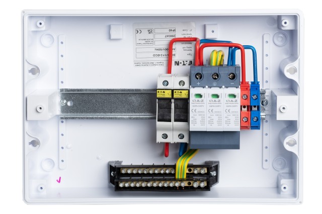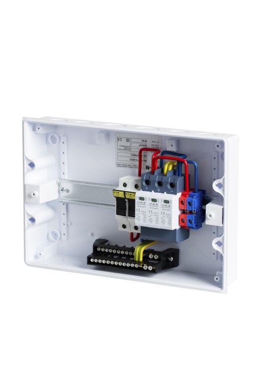 DC rozváděč v ochranné třídě 1+2 určený pro montáž na zeď, IP40 sloužící jako vstupní rozváděč od fotovoltaických panelů (ke střídači) pro celé portfolio fotovoltaických elektráren.