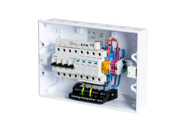 AC rozvádzač určený pre montáž na stenu, IP40/20C slúžiaci ako vstupný rozvádzač (pri striedači) pre trojfázové fotovoltaické elektrárne (typicky striedače: GOODWE, SOLAX, GROWATT, WATTSONIC a iné).