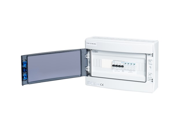 AC rozvádzač určený pre montáž na stenu, IP65/20C slúžiaci ako vstupný rozvádzač (pri striedači) pre trojfázové fotovoltaické elektrárne (typicky striedače: GOODWE, SOLAX, ,GROWATT, WATTSONIC a iné).