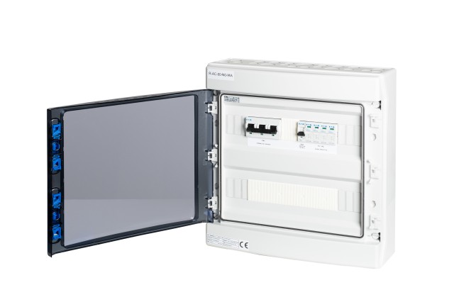 AC rozvádzač určený pre montáž na stenu, IP65/20C slúžiaci ako vstupný rozvádzač (pri striedači) pre trojfázové fotovoltaické elektrárne (typicky striedače: GOODWE, SOLAX, GROWATT, WATTSONIC a iné).