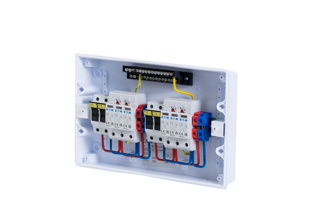 DC rozvádzač určený pre montáž na stenu, IP40/20 slúžiaci ako vstupný rozvádzač od fotovoltaických panelov (k striedaču) pre celé portfólio fotovoltaických elektrární. Najmä pri použití ostatných rozvádzačov taktiež EATON BC-O-1/12-ECO.